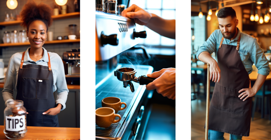 Prompt #1: A stylized portrait of a Black female barista standing confidently behind the counter, her hands tucked into the deep pockets of a well-worn canvas apron. She smiles with quiet pride, her presence calm yet inviting. Just behind her on a shelf, a glass jar labeled “TIPS” sits partially filled with coins, subtly catching the glow of warm orange light. The café behind her buzzes with life — blurred figures in motion, steam rising from an espresso machine, and warm chatter filling the air. The background is rendered in rich teal tones with soft orange highlights, blending intimacy, craft, and the rhythm of a thriving café.
