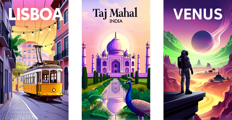 Prompt #1: “LISBOA” — bold and elegant text crowns a vibrant travel poster for Portugal. A bright yellow streetcar winds through the hilly streets of Lisbon, framed by stylized buildings in dreamy tones of purples, pinks, greens, and warm oranges. The composition is clean and symmetrical, with soft gradients, no black outlines, and a luminous, flat-design aesthetic. Overhead, delicate string lights crisscross the deep pink-orange sky, while tropical vegetation and tile accents evoke the city's iconic charm. The scene radiates warmth and rhythm, blending old-world beauty with a surreal, contemporary glow—perfectly pairing with the timeless elegance of the Taj Mahal series.