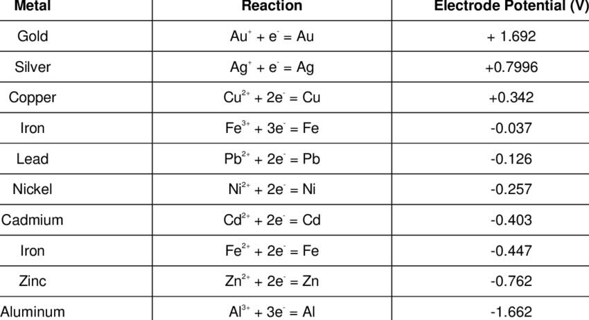 | Metal | Reaction | Electrode Potential (V) |