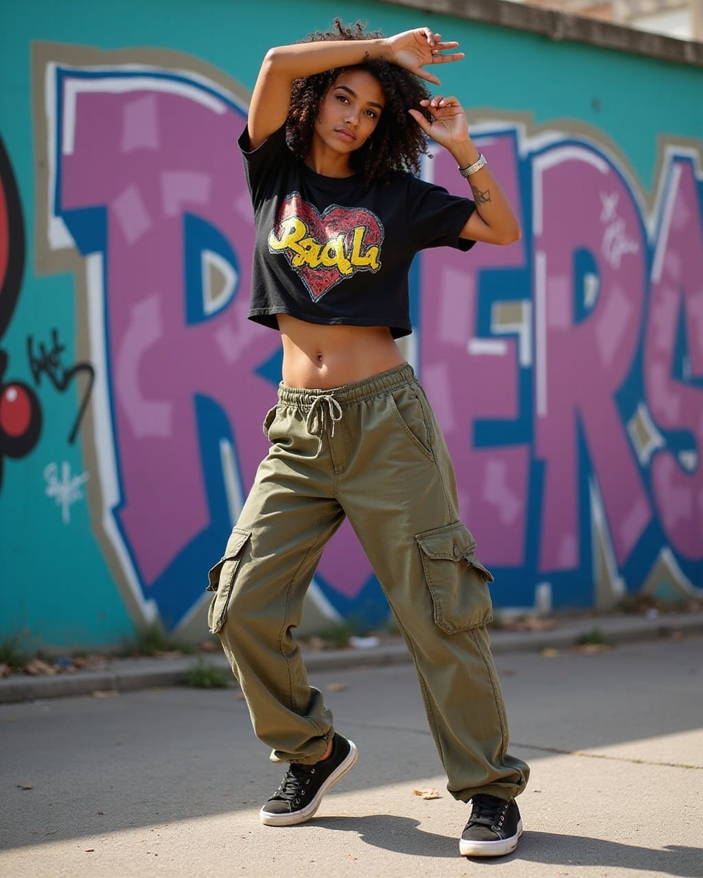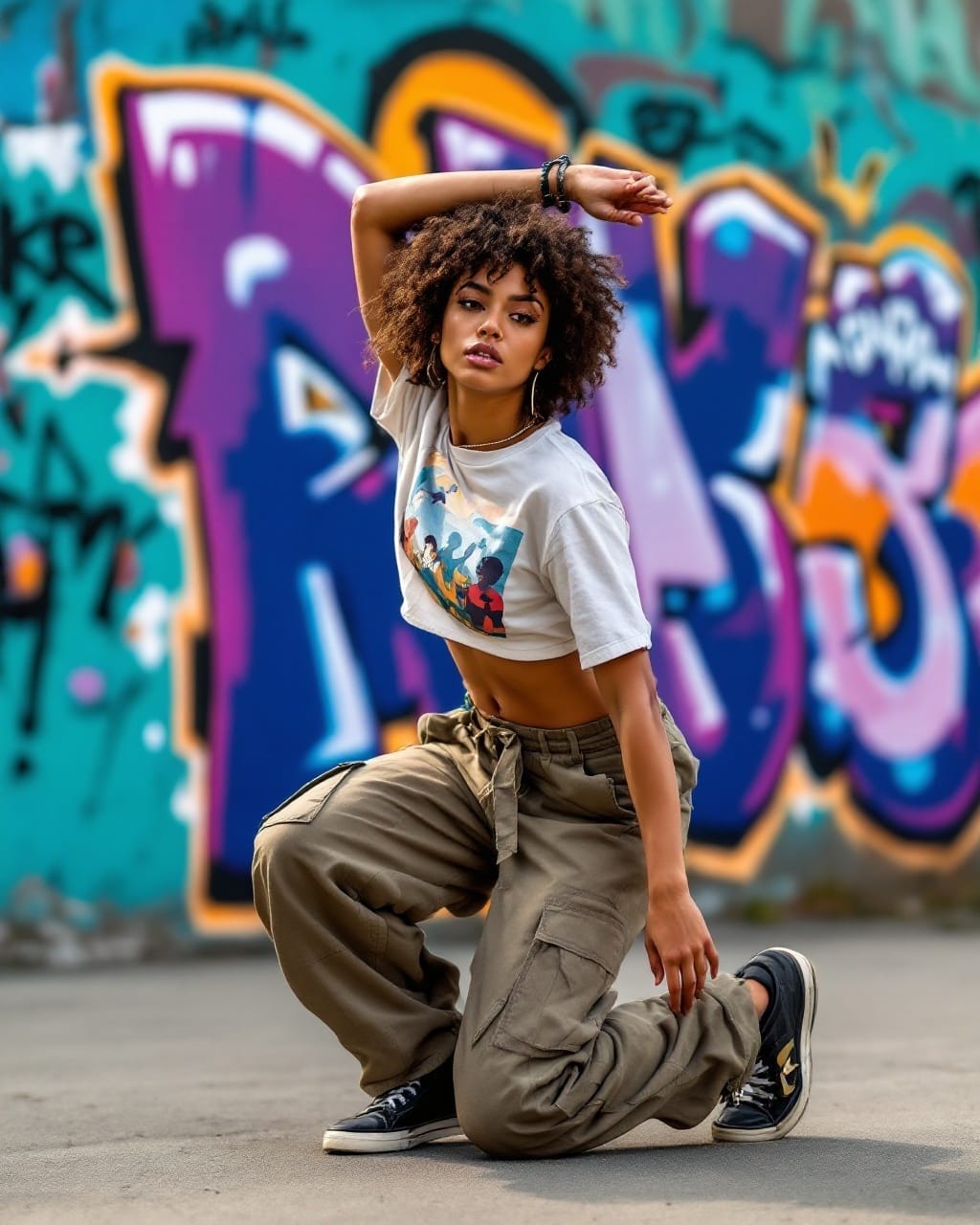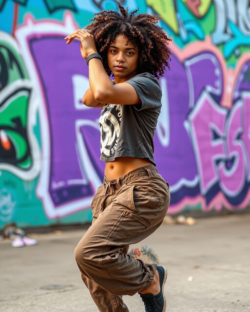 Prompt #1: A Brazilian street dancer with caramel skin and curly hair wearing a cropped graphic tee and loose cargo pants mid-movement in an expressive hip-hop pose a vibrant graffiti-covered wall behind them.