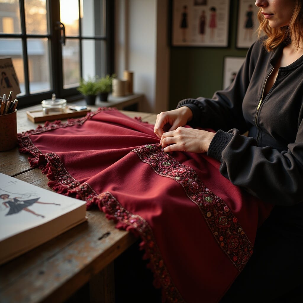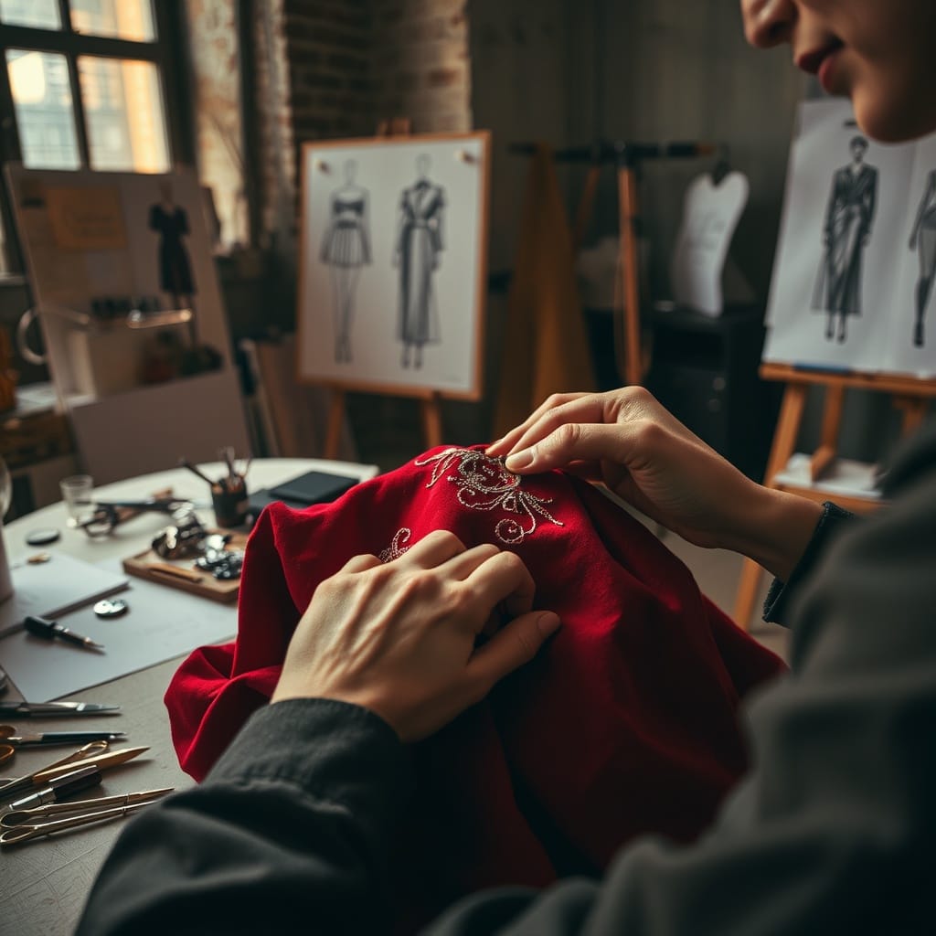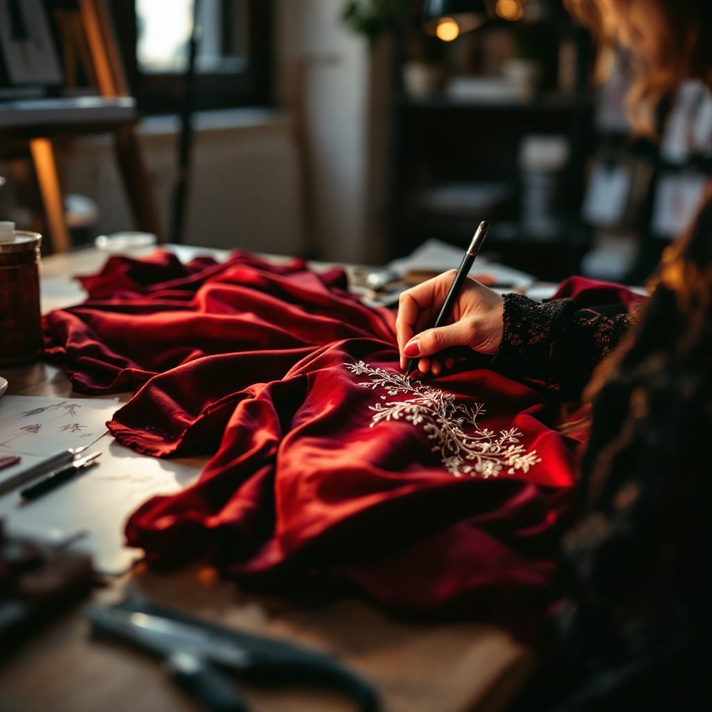 Prompt # 2: A close-up of a fashion designer’s hands stitching intricate embroidery onto a luxurious deep-red fabric, a desk scattered with sewing tools, fashion sketches pinned to a board in the background, golden light streaming through a loft-style studio window, intimate and artistic composition.