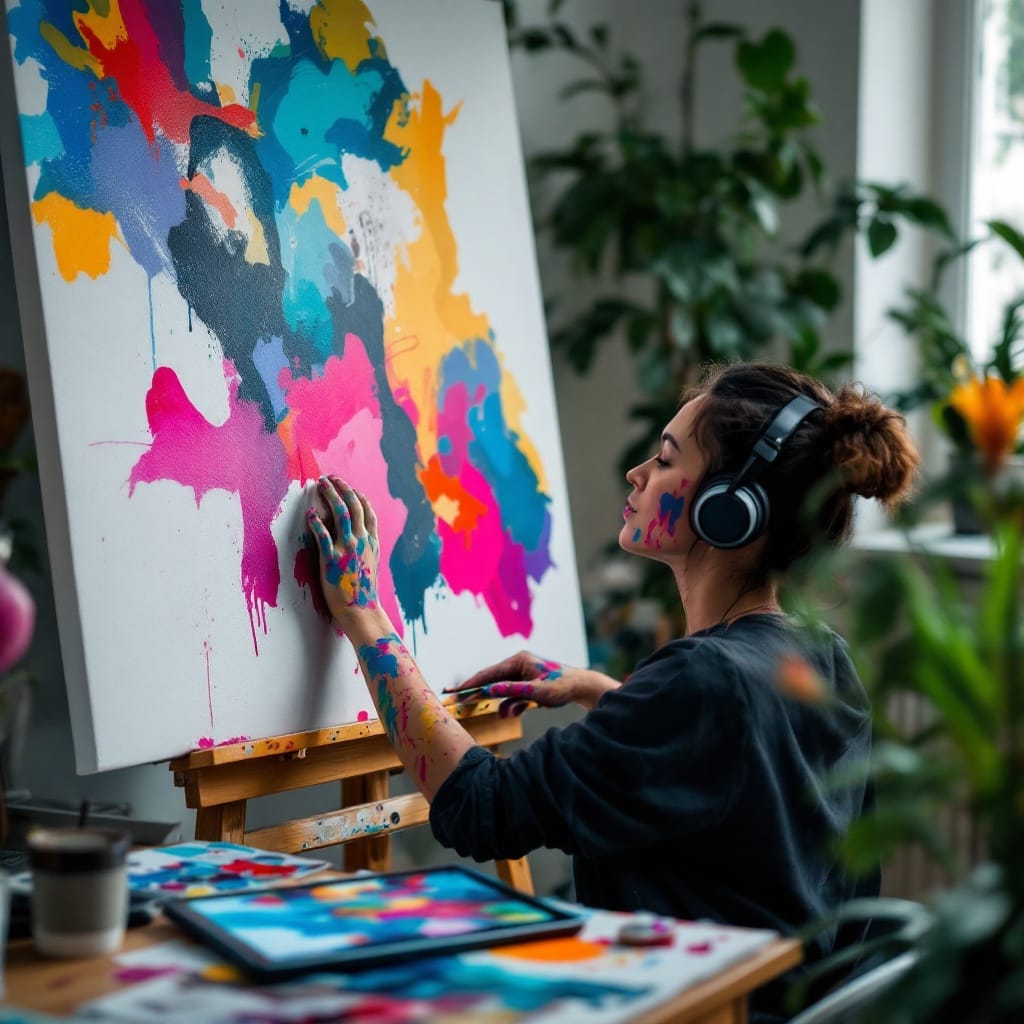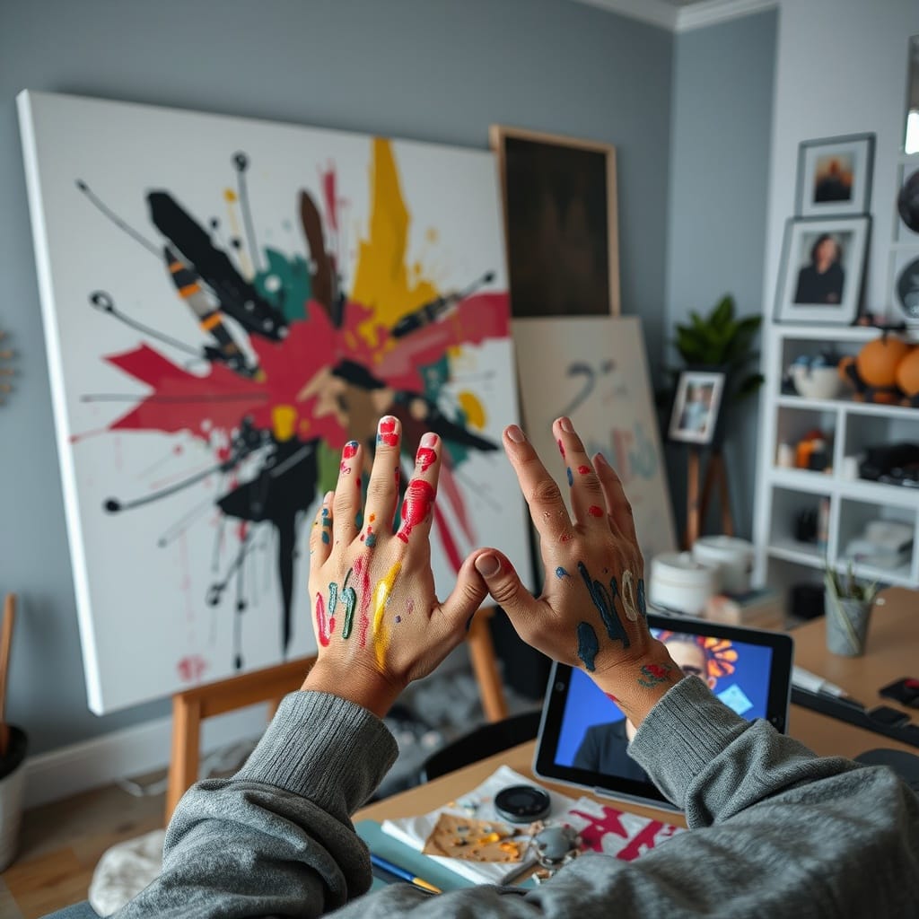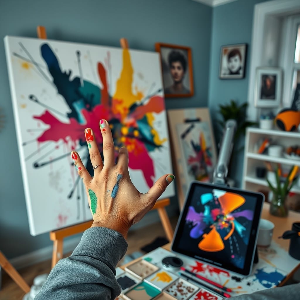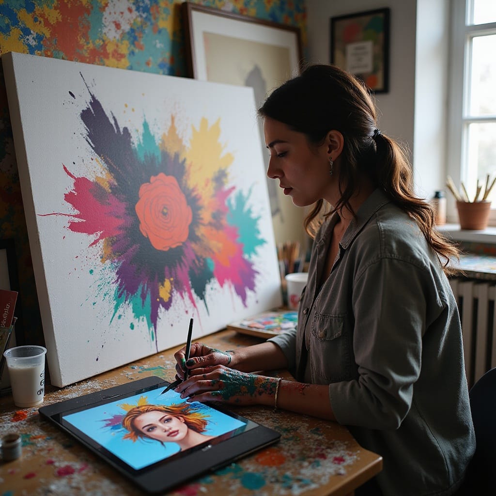 Prompt # 4: A mid-shot of a digital artist in a home studio, their hands covered in colorful paint as they blend digital and traditional techniques, an oversized canvas leaning against the wall displaying an abstract piece, a tablet on the desk showing a digital painting in progress, creative and expressive atmosphere.