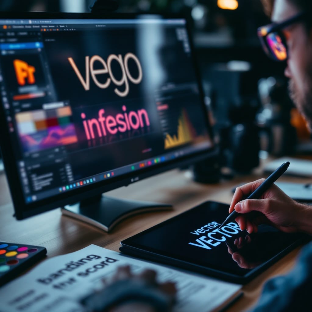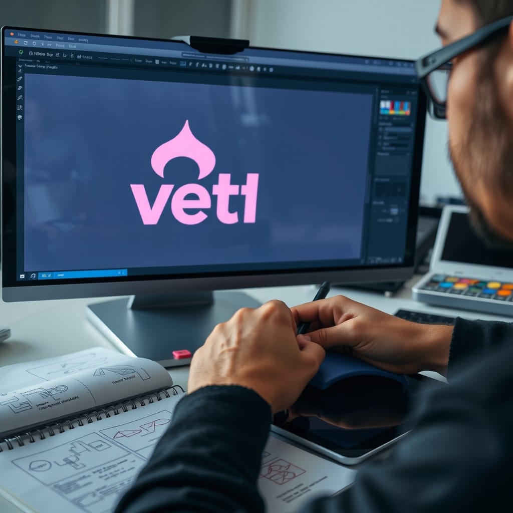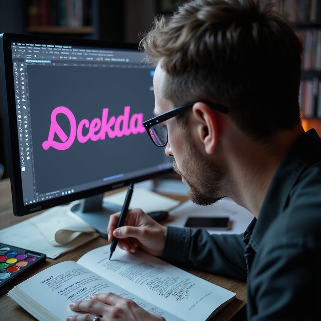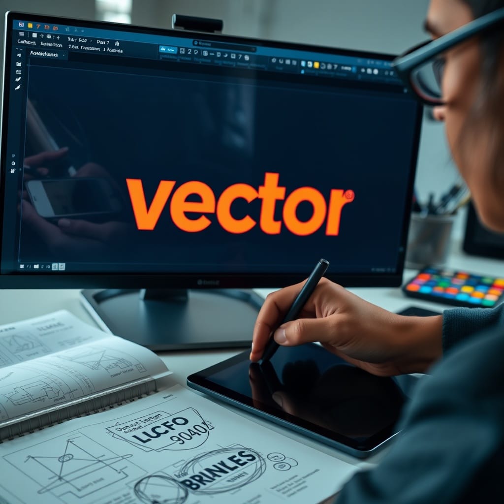 Prompt # 5: An extreme close-up of a graphic designer adjusting a vector logo on a high-resolution screen, reflection of bold typography visible in their glasses, a color palette and a tablet stylus resting beside a sketchbook filled with branding concepts, sharp and modern workspace aesthetic