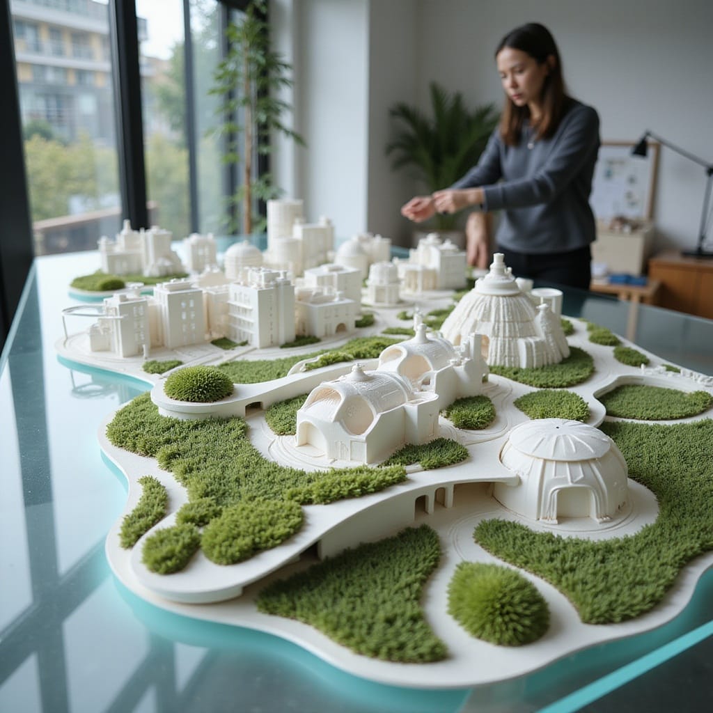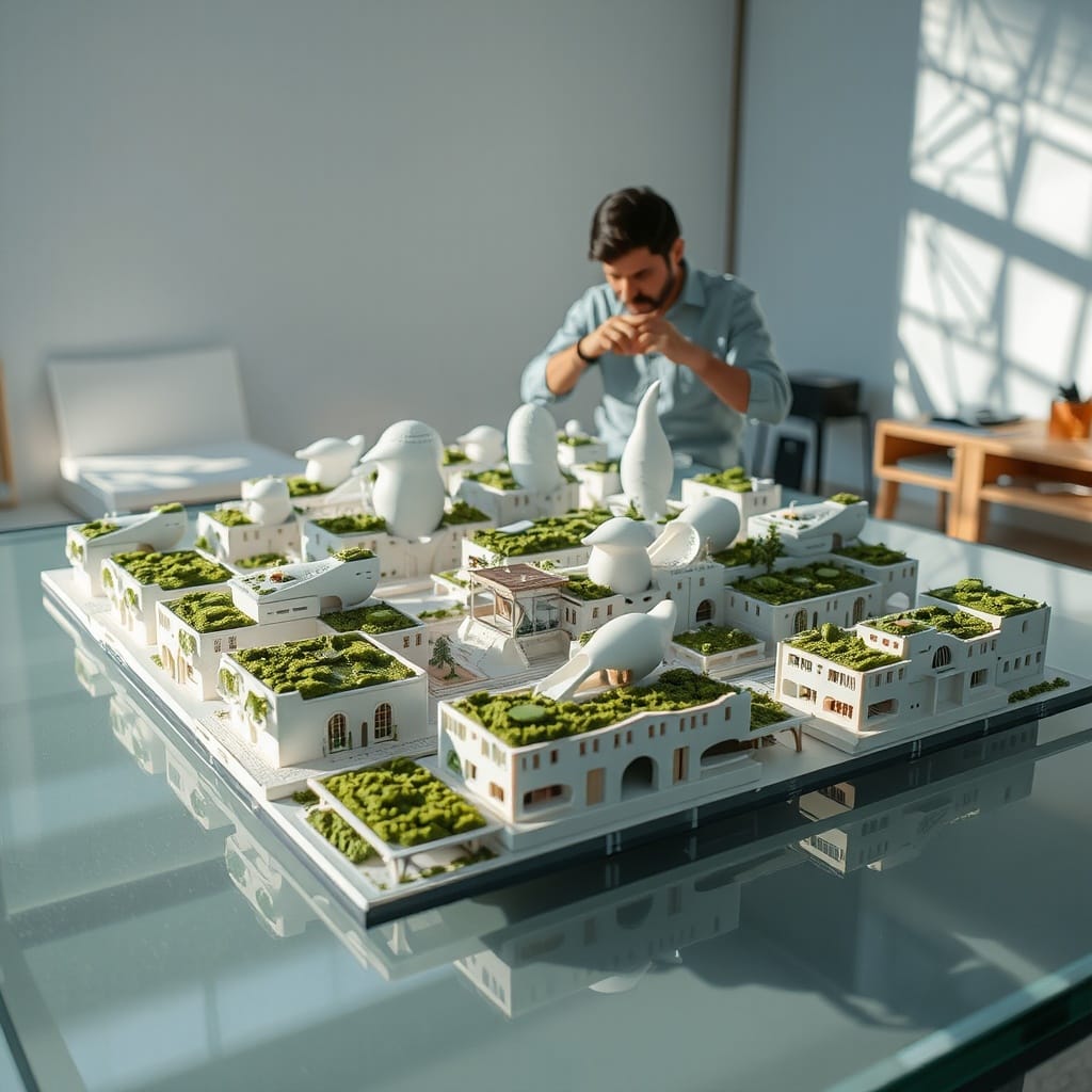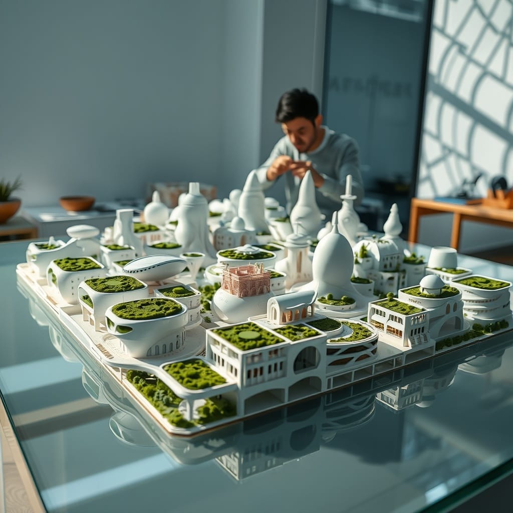 Prompt # 3: A far shot of a sprawling architectural concept model displayed on a sleek glass table, miniature futuristic buildings with organic curves and green rooftops, soft lighting casting intricate shadows on the walls, a designer in the background adjusting a 3D-printed structure, innovative and forward-thinking aesthetic